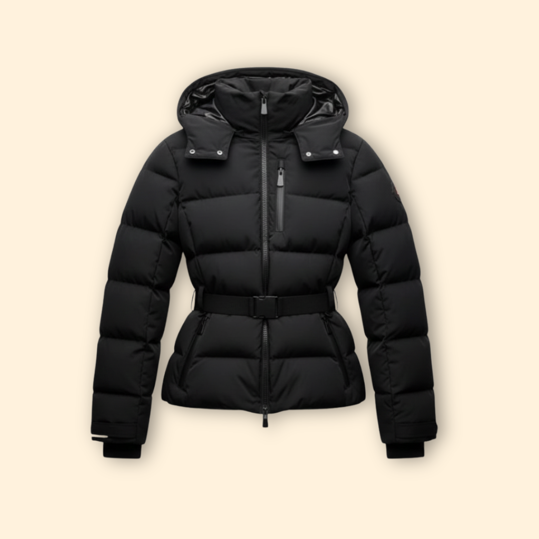 This jacket shows a high collar with a front zipper extending to the hem. An adjustable belt is set at the waist. Long sleeves end in cuffs, and the front holds zippered pockets. The exterior displays a segmented quilted pattern across the surface.